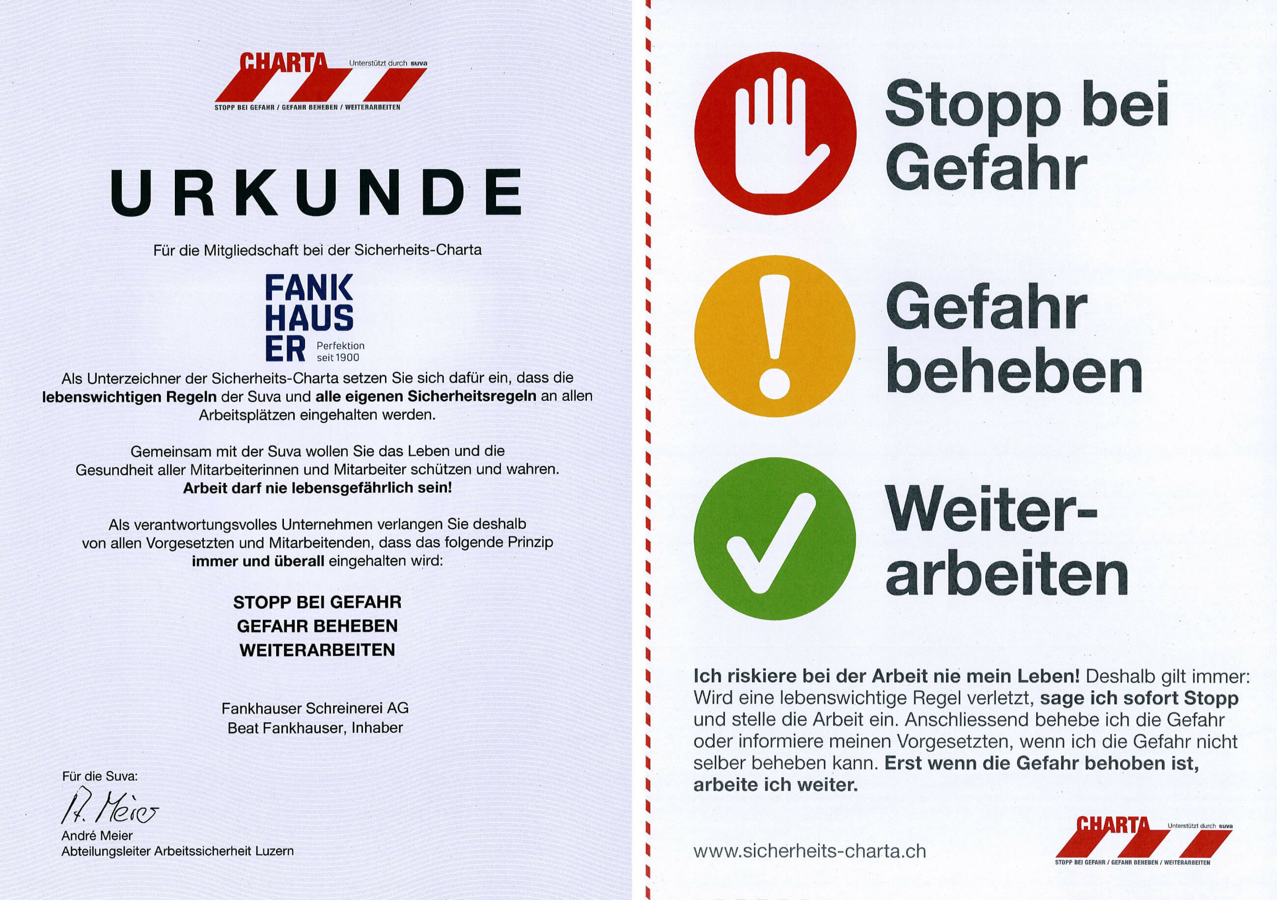 Mehr Sicherheit am Arbeitsplatz ist das Ziel der Sicherheits-Charta. Sie wurde von der Suva in Zusammenarbeit mit Arbeitgeberverbänden, Planern und Gewerkschaften ins Leben gerufen. STOPP bei Gefahr, Gefahr beheben, weiterarbeiten. Die Unterzeichner der Charta setzen sich dafür ein, dass am Arbeitsplatz die Sicherheitsregeln eingehalten werden. Arbeiten darf nicht lebensgefährlich sein.